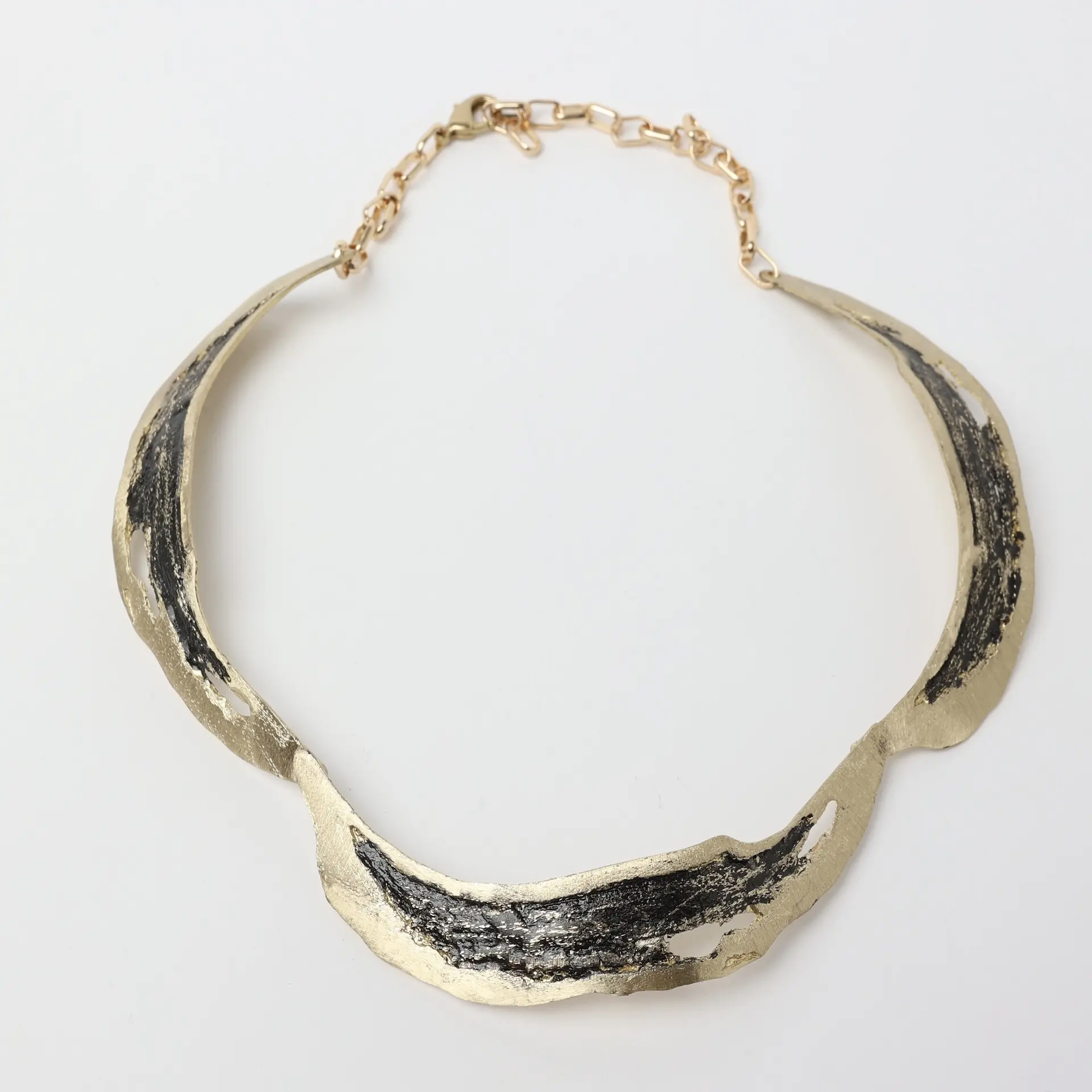 Collar rígido en bronce con diseño orgánico y texturizado que se adapta al contorno del cuello. Disponible en acabado bronce natural y en bronce con oxidación negra, esta pieza escultural aporta fuerza y elegancia a cualquier look.