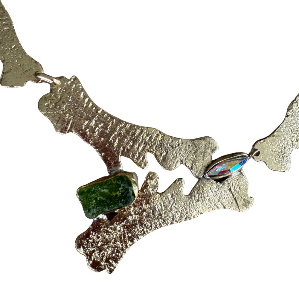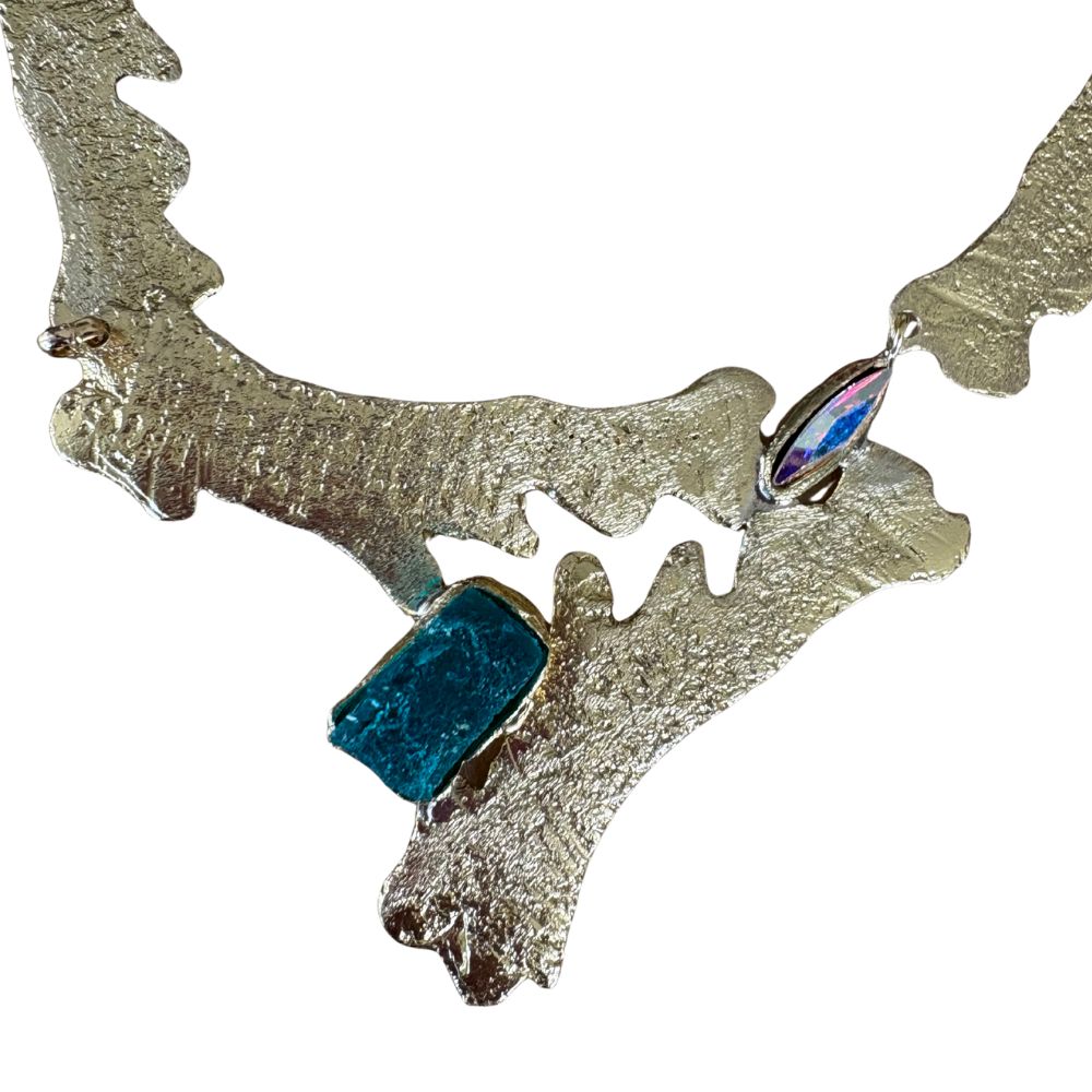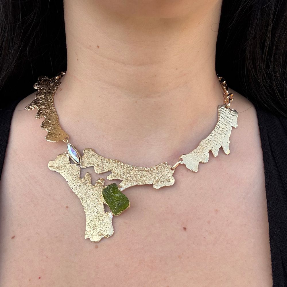 Collar en bronce con eslabones irregulares y diseño orgánico, protagonizado por una pieza central en resina, disponible en color verde y en color azul. Una joya artesanal con carácter, ideal para realzar el escote con estilo y sofisticación.