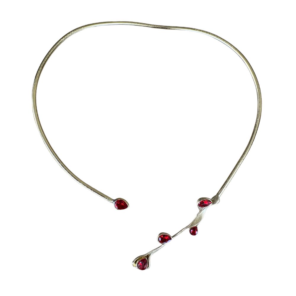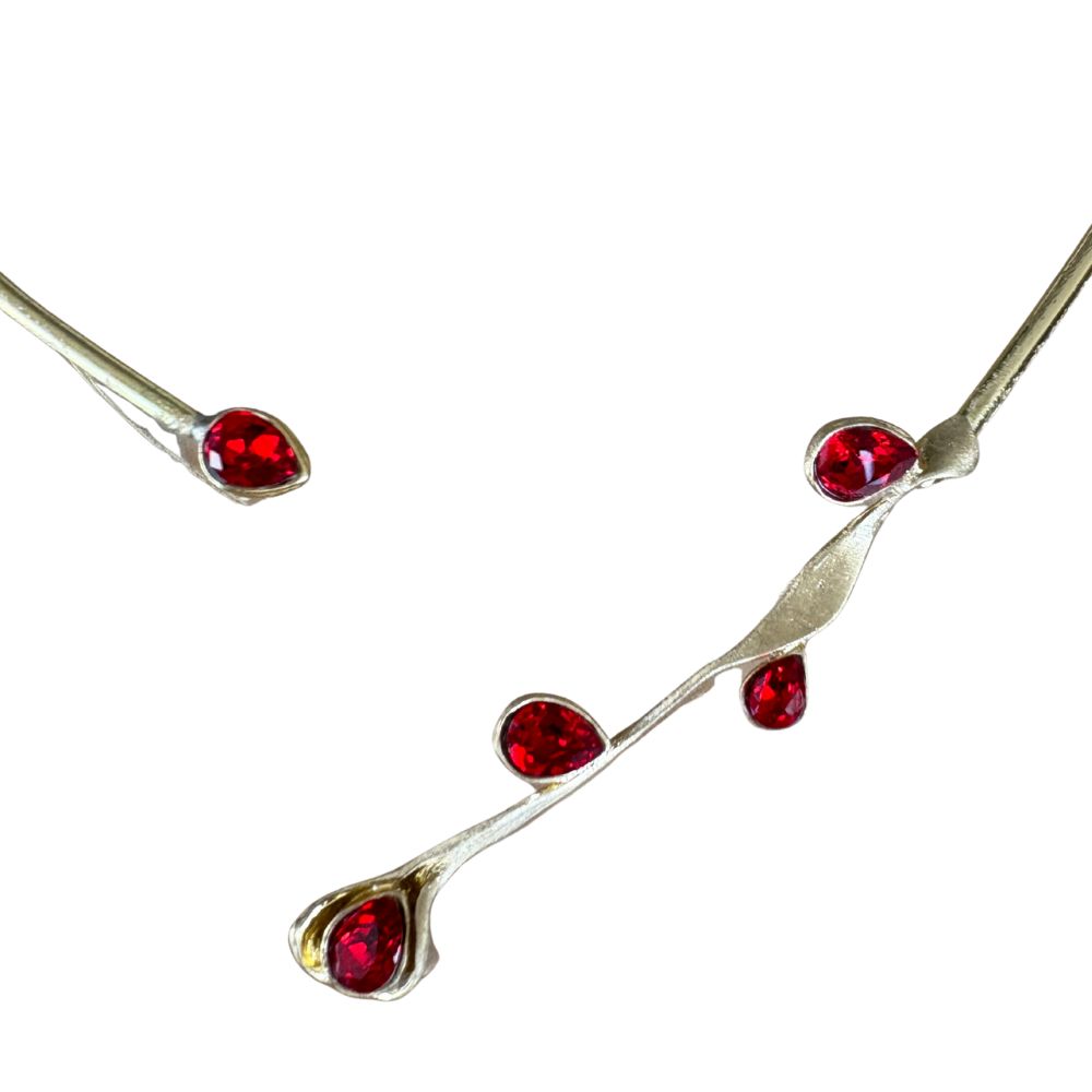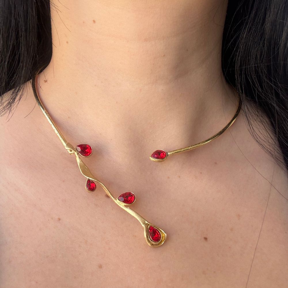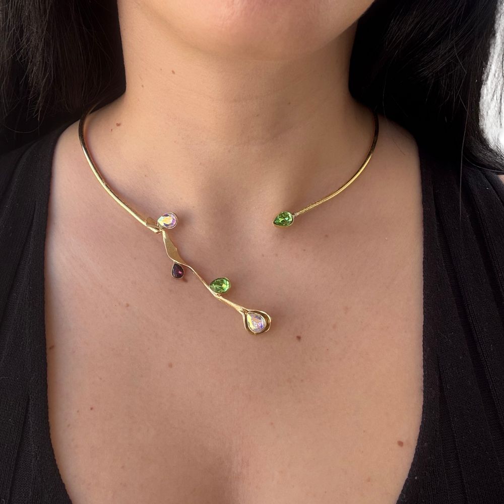 Collar en bronce de diseño abierto con delicadas curvas orgánicas, adornado con pequeñas piedras en disponible en color rojo y en color multicolor. Una pieza elegante y artística que combina sutileza y originalidad, ideal para destacar cualquier look con un toque distintivo.