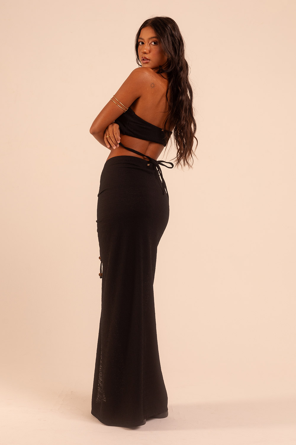 Top en tejido elástico con detalles en tirantes, amarre cruzado al cuello. Sexy y moderno, perfecto para un look de noche o de playa.